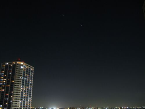 今週は国際宇宙ステーション(ISS)がよく見られる当たり週です。しかも今日は、ISSを離れたばかりのスペースシャトルとのランデブーを見られるかも! ということでカメラを用意して待機したところ、並んでツツーと移動する二つの光点が。おおー、すごい。写…