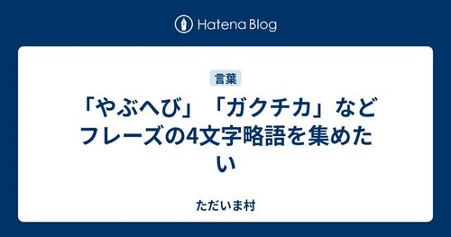 フレーズを4文字に略した言葉って面白いなと考えていて、気付いたら書き留めている。今までに集めたのは以下。なんとなく古くからありそうな順(適当)に並べた。 やぶへび←「藪をつついて蛇を出す」 カモネギ←「鴨がネギをしょってくる」 たなぼた←「棚から…