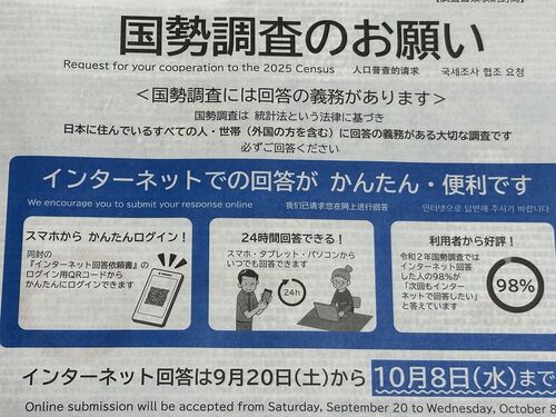 5年に一度の国勢調査がやってきた。最初にログインID(半角8文字)とアクセスキー(半角4文字)を入力する。スマホの人はQRコードを読み込むとログインIDやアクセスキーが自動で入力される。今回はパソコンで回答した。設問の内容で覚えているのは「家の広さ…