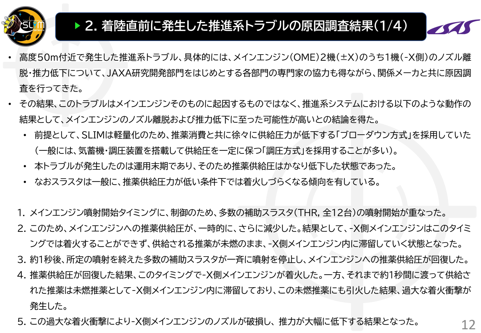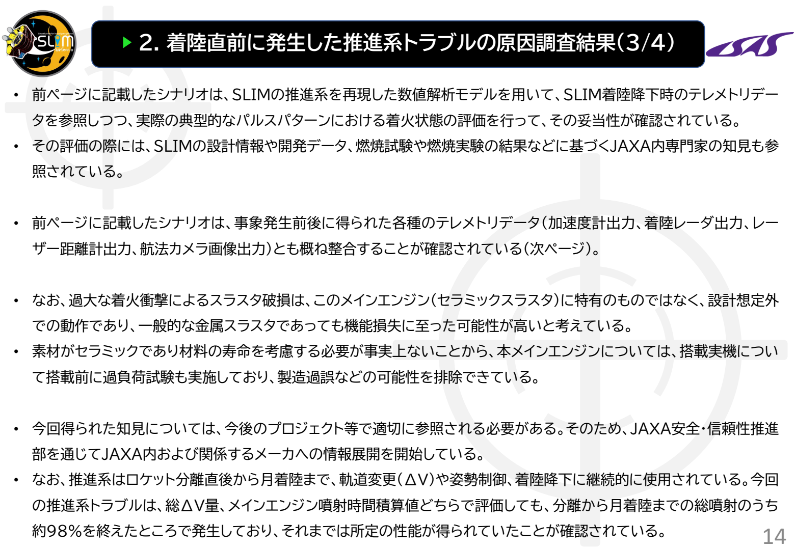 坂井:いくつか要因がある。98%まで正常だったこともあり、なかなか起きえない事象だった。試験では難しかった。実際の燃焼は真空中だがスラスタを組み合わせる試験は大気圧下でしか行えなかった。
