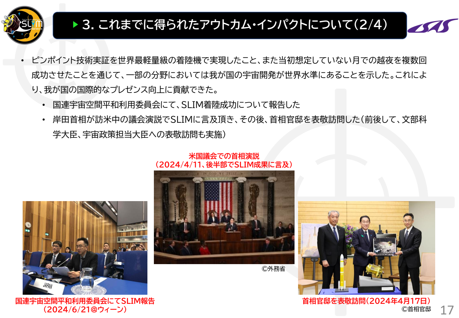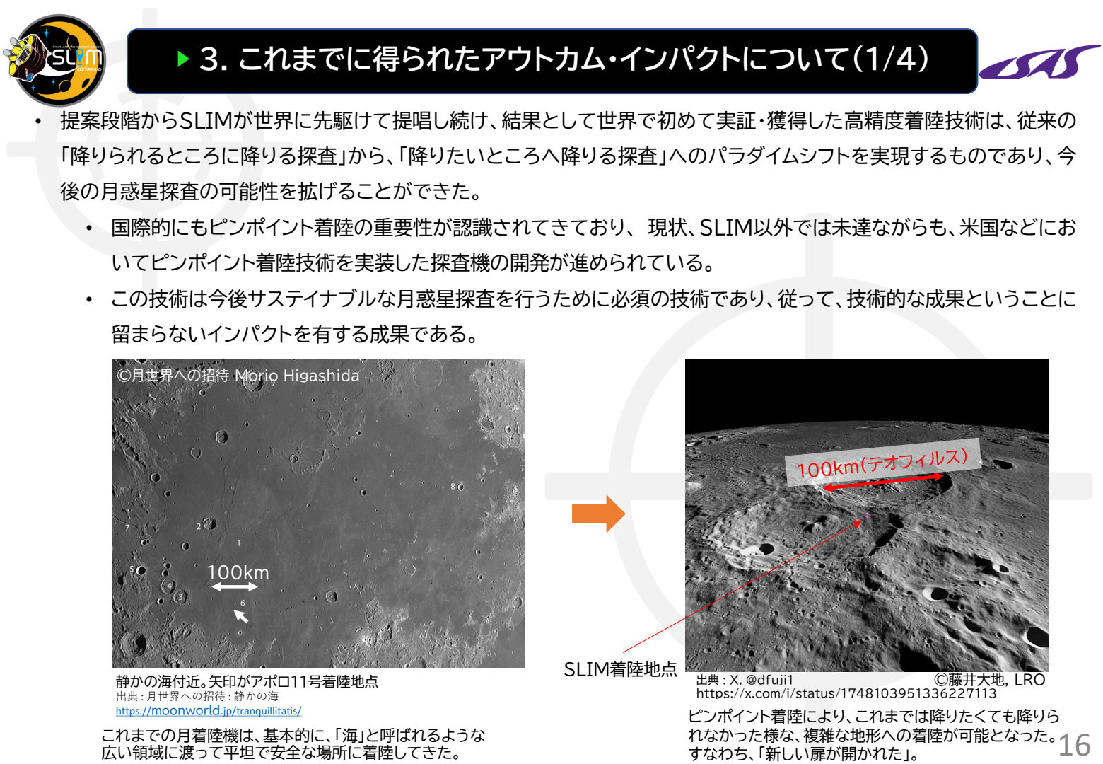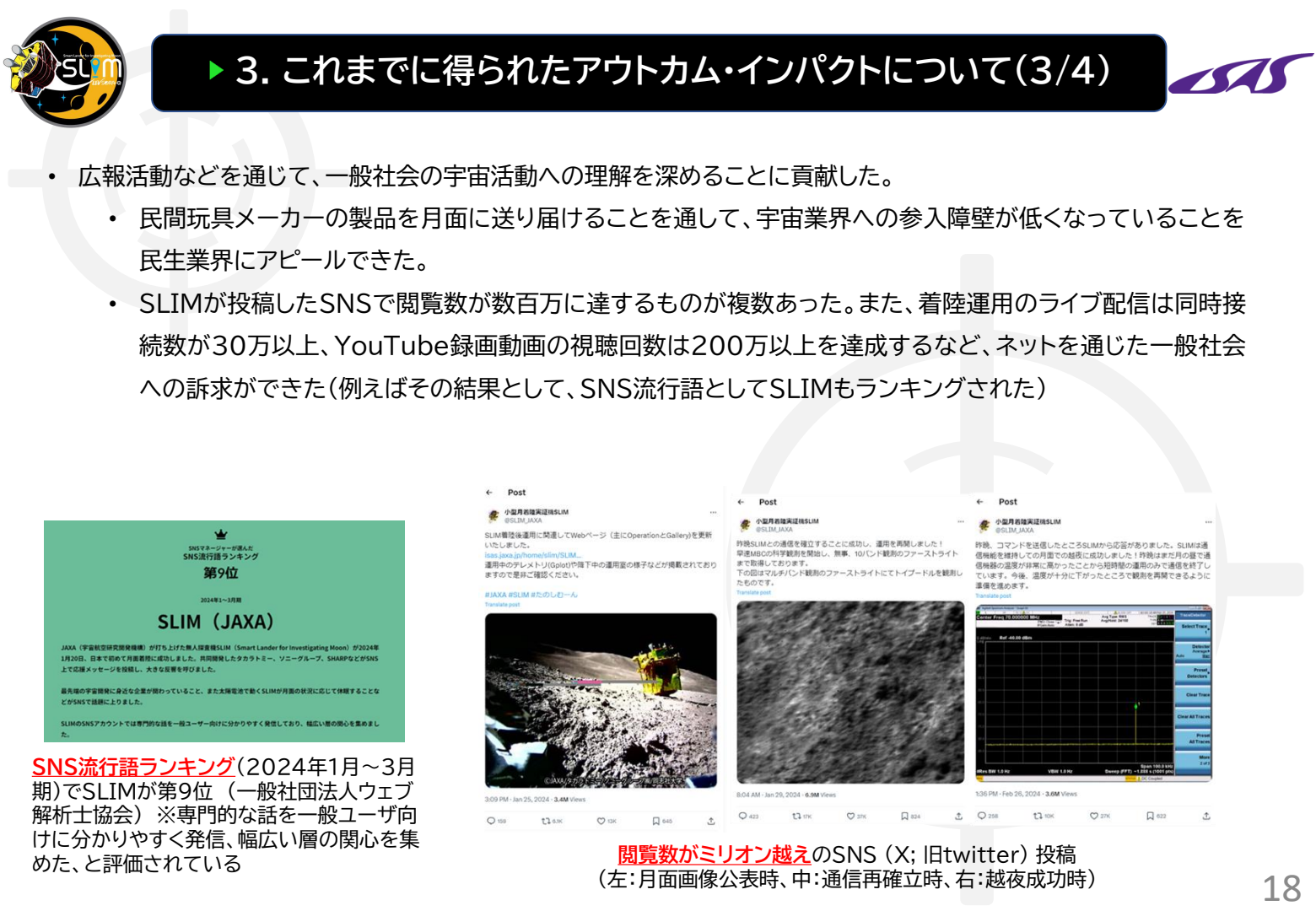 ムーン・アンド・プラネッツ寺薗:成果の中に社会的なインパクトを含めていただいたことを本当に嬉しく思います。SLIMはメイン広報をX(旧Twitter)で行っており、閲覧数が数百万を超えるポストもありました。これらは歴史的にも貴重であり、今後の探査広報などでも重要な成果、指針となるかと考えられます。