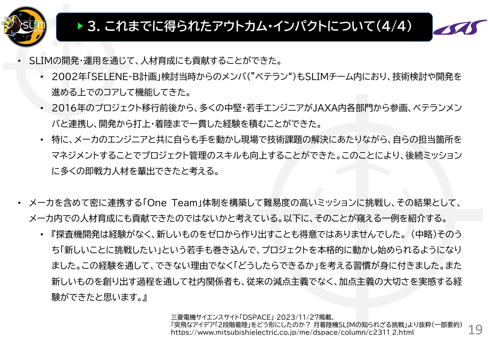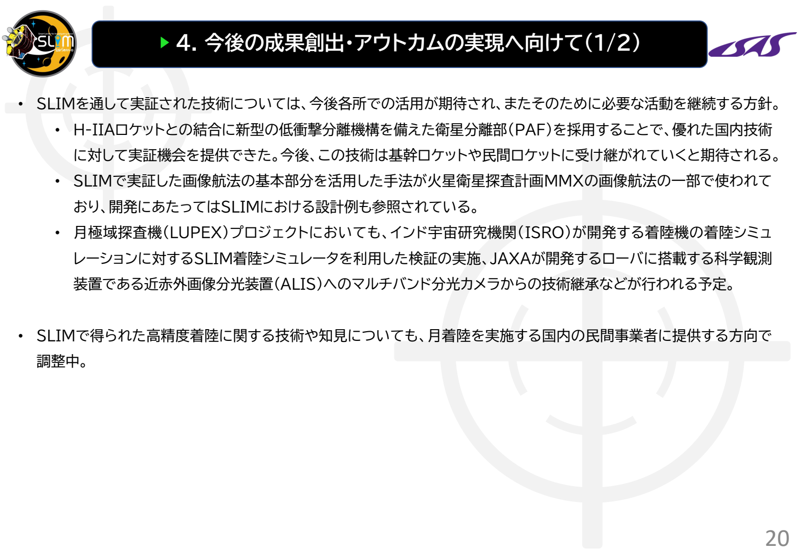 坂井:暖かい質問をありがとうございます。SLIMのホームページで成果や技術情報を公開している。チーム解散後も当面の間は保存する。Xは悩んでいるところ。解散したらアカウントを削除することも考えていたがいろいろな声を聞いて内部で相談中。